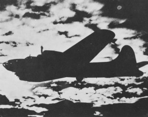 A B17 “Flying Fortress” against a clouded sky. Dad says they also called these planes “Big Ass Birds” because of their large tails. Photo by James E. Rung.